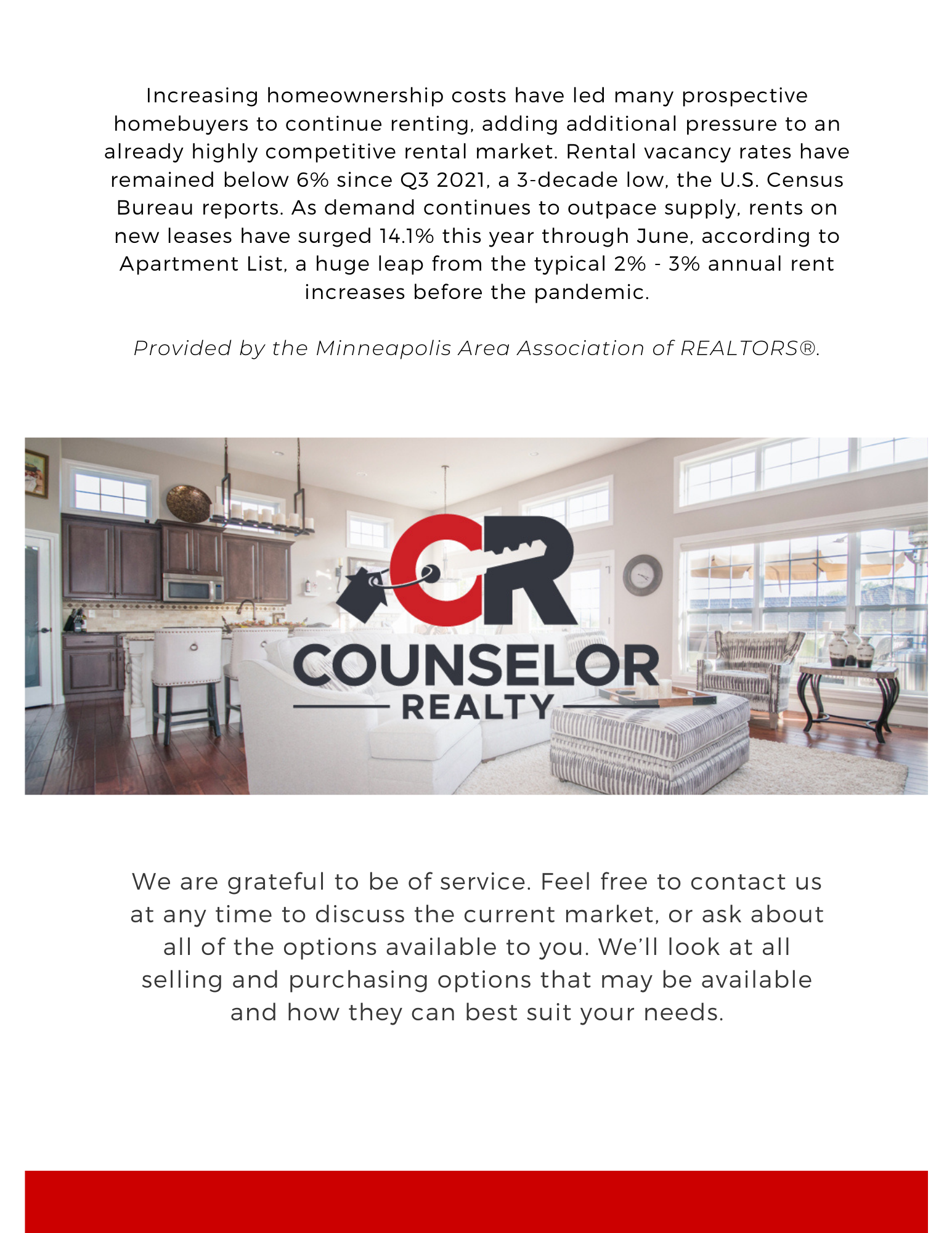 Agency License Information: Counselor Realty, Inc. is licensed in Minnesota and Wisconsin; Counselor Realty, Inc. of Alexandria is licensed in Minnesota; Counselor Realty Detroit Lakes, LLC is licensed in Minnesota; Counselor Realty of Rochester is licensed in Minnesota; Counselor Realty of Victoria, LLC is licensed in Minnesota; Counselor Realty of Brainerd is licensed in Minnesota.