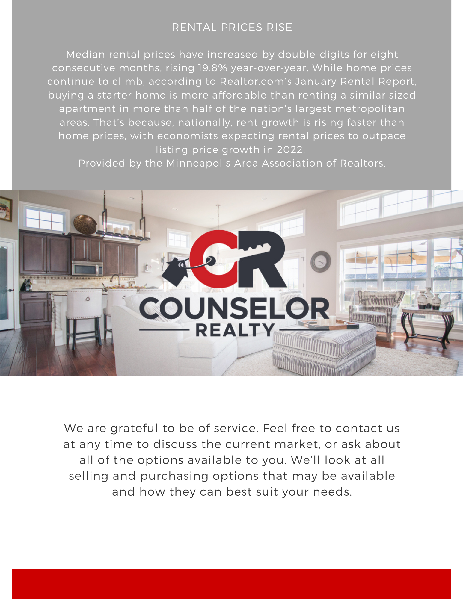Agency License Information: Counselor Realty, Inc. is licensed in Minnesota and Wisconsin; Counselor Realty, Inc. of Alexandria is licensed in Minnesota; Counselor Realty Detroit Lakes, LLC is licensed in Minnesota; Counselor Realty of Rochester is licensed in Minnesota; Counselor Realty of Victoria, LLC is licensed in Minnesota; Counselor Realty of Brainerd is licensed in Minnesota.